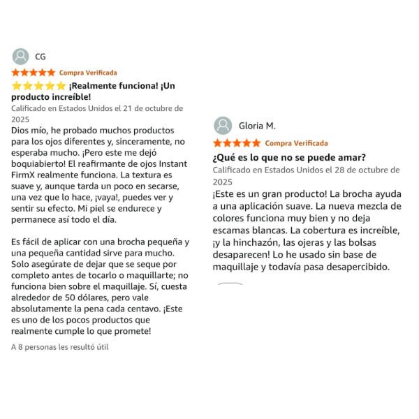 que actúan sobre los efectos visibles del envejecimiento a largo plazo. Sin parabenos, formaldehído, liberadores de formaldehído, ftalatos, aceite mineral, palmitato de retinilo, oxibenzona, alquitrán de hulla, hidroquinona, sulfatos SLS y SLES, triclocarbán, triclosán y menos del uno por ciento de fragancia sintética. Información adicional: Fácil de usar y cómoda de llevar, esta fórmula clínicamente avanzada se adapta a todo tipo de piel y tonos, y no se cuartea bajo el maquillaje. Firm-A-Tite™ tensa, reafirma y suaviza rápidamente la apariencia del contorno de ojos, mientras que su potente tecnología de péptidos proporciona resultados reafirmantes visibles y duraderos. Además, ha sido probado por oftalmólogos. Resultados clínicos: En un estudio clínico inmediato realizado con 39 mujeres de entre 36 y 69 años: - Esta fórmula ha demostrado clínicamente reducir de inmediato la apariencia de bolsas, líneas de expresión, arrugas profundas y patas de gallo. En un estudio inmediato de percepción del consumidor realizado con 39 mujeres de entre 36 y 69 años: - El 95 % afirmó sentir firme y tersa la zona del contorno de ojos . - El 92 % afirmó sentir la piel con efecto lifting.