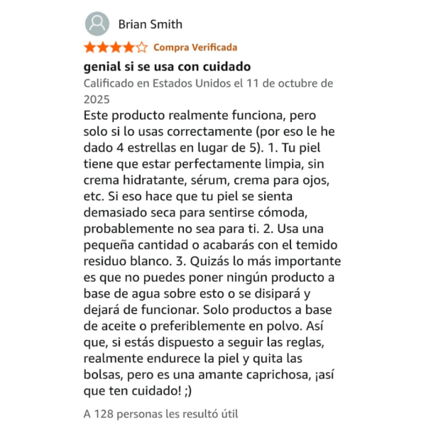 Qué es: Una fórmula de fácil aplicación que reduce rápidamente la apariencia de bolsas y arrugas debajo de los ojos, sin dejar residuos ni formar grumos.