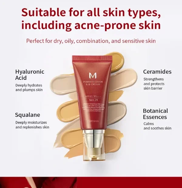 Combina el cuidado de la piel y el maquillaje en un solo paso para una piel impecable con M Perfect Cover BB Cream FPS 42 PA+++. M Perfect es una crema BB que ofrece una cobertura media-alta, manteniendo el maquillaje ligero y brindando protección UV con hidratación duradera.