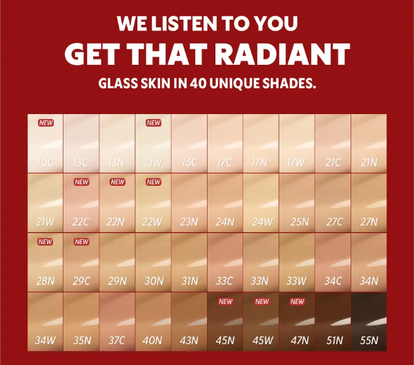 Agua, ciclopentasiloxano, dióxido de titanio (CI 77891), trimetilsiloxisilicato, propanodiol, óxidos de hierro (CI 77492), isododecano, octildodecanol, difenilsiloxifenil trimeticona, metil trimeticona, niacinamida, PEG-10 dimeticona, dimeticona, PEG/PPG-18/18 dimeticona, 1,2-hexanodiol, poligliceril-3 polidimetilsiloxietil dimeticona, sulfato de magnesio, óxidos de hierro (CI 77491), hectorita de disteardimonio, óxidos de hierro (CI 77499), isoestearato de poligliceril-4, ácido esteárico, hidróxido de aluminio, alúmina, ácido polihidroxiesteárico, sorbato de potasio, trietoxicaprililsilano, triisoestearato de isopropil titanio, fragancia (perfume). Dietilhexanoato de neopentilglicol, adenosina, disuccinato trisódico de etilendiamina, polimetilmetacrilato, aceite de Haematococcus pluvialis, butilenglicol, glicerina, dipropilenglicol, palmitoil prolina sódica, polímero cruzado de cetearil dimeticona/vinil dimeticona, extracto de flor de Hibiscus sabdariffa, astaxantina, extracto de flor de Rosa rugosa, extracto de Pancratium maritimum, extracto de flor de Nymphaea alba, extracto de propóleo.
