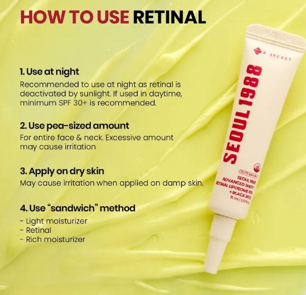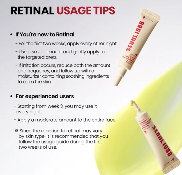 Si usted nunca utilizo retinoides se recomienda hacer una prueba de parche en la piel antes de utilizarlo para ver como reacciona su piel. El uso de cualquier retinoide lleva un proceso de rutinización de la piel, el cual debe ser gradual para que la piel pueda asimilarlo bien, comience aplicándolo 2 noches por semana, luego, la siguiente semana 3 noches y así continua agregando 1 noche mas cada semana hasta lograr usarlo todos los días.