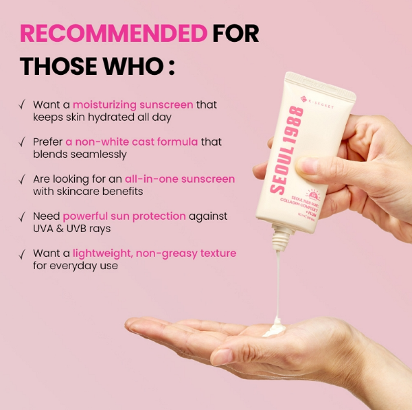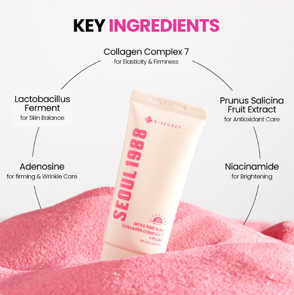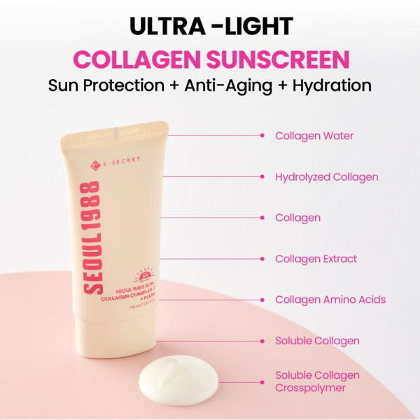 Este protector solar tiene SPF50+ PA++++ y está formulado con 7 tipos de colágeno para hidratar la piel a la vez que promueve una apariencia saludable y juvenil.