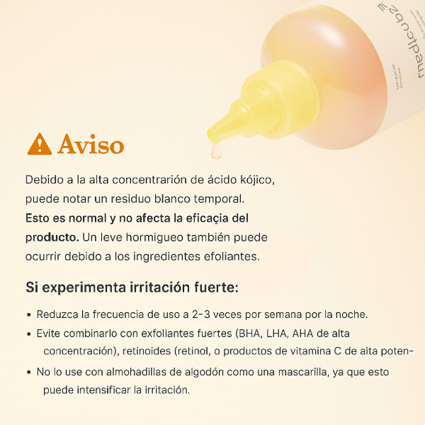 - [Fórmula Avanzada] Una potente combinación de ácido kójico, cúrcuma, ácido glicólico y niacinamida que actúa en sinergia para exfoliar, suavizar e iluminar el tono general de la piel, revelando una tez más clara, radiante y luminosa.