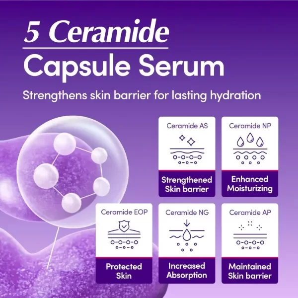 Formulado con 5 tipos de ceramidas, fortalece la barrera cutánea y fomenta la hidratación.