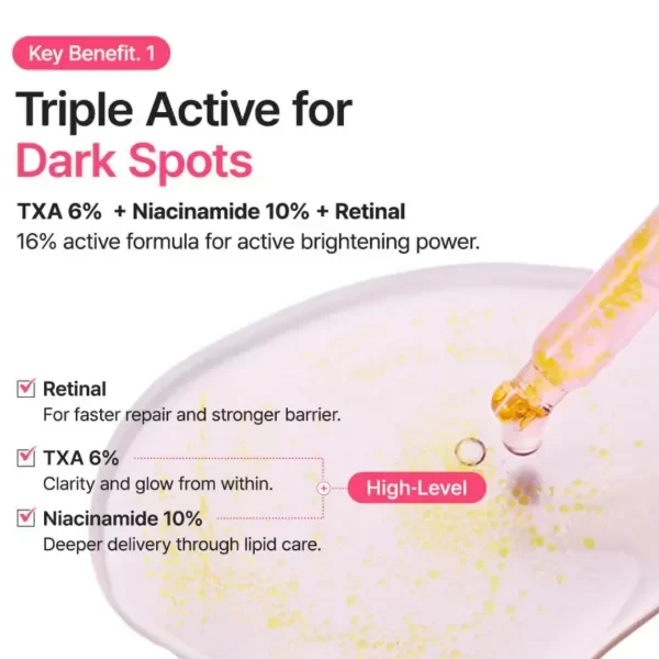 El retinal repara la piel más rápidamente y fortalece la barrera cutánea; el TXA al 6% aporta luminosidad y claridad desde el interior; y la niacinamida al 10% penetra profundamente gracias a su fórmula con cuidado lipídico.