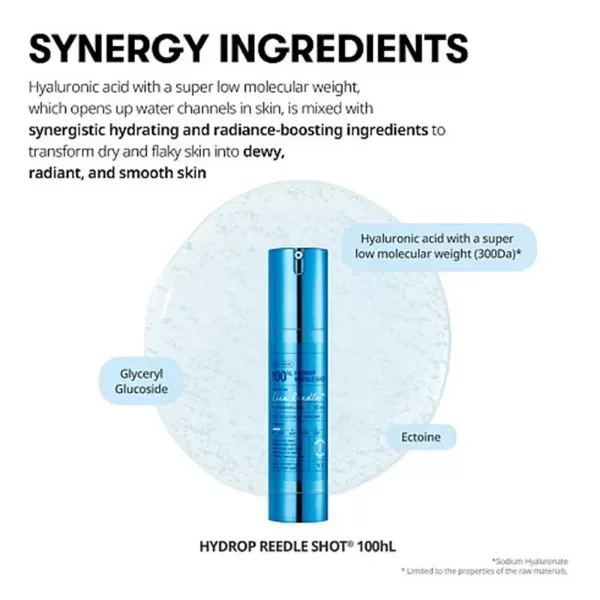Este Hydrop Reedle Shot 100 hL con ácido hialurónico de bajo peso molecular aporta humedad a la piel, creando una piel de aspecto saludable y radiante.