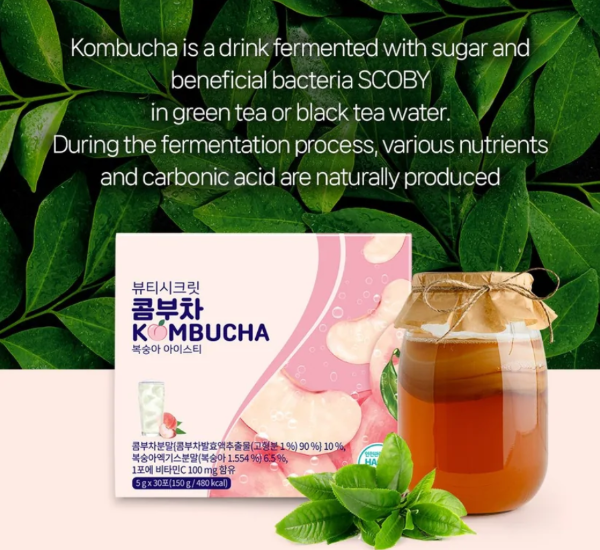 -16 kcal por barra, kombucha con sabor a melocotón, baja en calorías y sin azúcar.