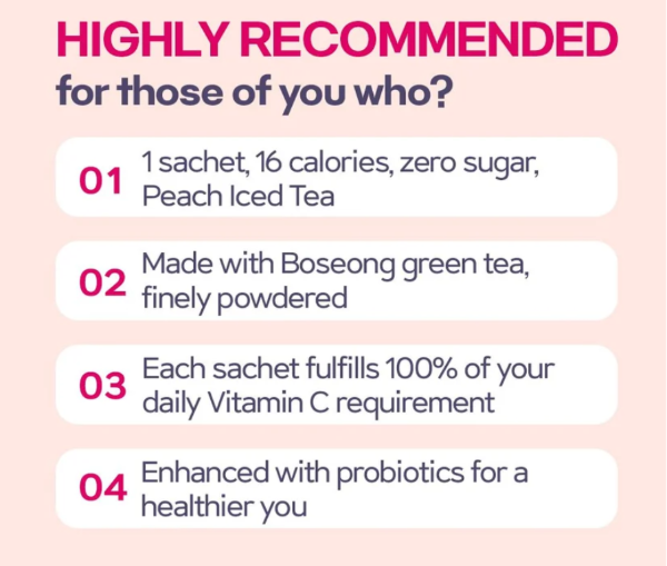 Ácido cítrico, bicarbonato de sodio, polvo de kombucha, eritritol, polvo de extracto de melocotón, isomalt, preparación mixta (polvo con sabor a melocotón, dextrina, propilenglicol, fragancia, alcohol, goma arábiga, acetato de etilo), vitamina C, polvo de extracto de té negro Dimbla, fructooligosacárido, polvo de ciruela concentrado, dióxido de silicio, stevia tratada con enzimas, ácido DL-málico, fragancia (sabor a ciruela), sucralosa, 17 tipos de bacterias de ácido láctico mixtas, maltodextrina no digerible, preparación de mezcla de aminoácidos (L-glutamina, L-leucina, L-fenialanina, clorhidrato de L-lisina, L-valina, L-treonina, L-isoleucina, L-metionina, L-triptófano), mezcla de vitaminas y minerales {fosfato de calcio dibásico, óxido de magnesio, vitamina C, mezcla de vitamina B12 (dextrina, citrato trisódico, ácido cítrico, vitamina B12), amida de ácido nicotínico, hierro reducido, óxido de zinc, mezcla de vitamina D3 (azúcar, goma arábiga, almidón de maíz, aceite procesado, dióxido de silicio, vitamina D3, vitamina E), clorhidrato de vitamina B6, clorhidrato de vitamina B1, vitamina B2, mezcla de vitamina A (jarabe de glucosa en polvo, goma arábiga, almidón de maíz, acetato de vatimina A, vitamina E), mezcla de vitamina E (acetato de DL-α-tocoferilo, jarabe de uva en polvo, almidón modificado, dióxido de silicio), maltodextrina, ácido fólico